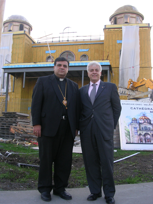 Mr. Maalouf visiting the construction site of the Melkite Cathedral in Montreal with Bishop Ibrahim Ibrahim